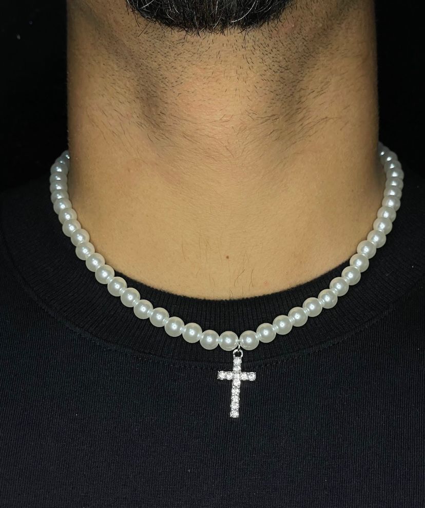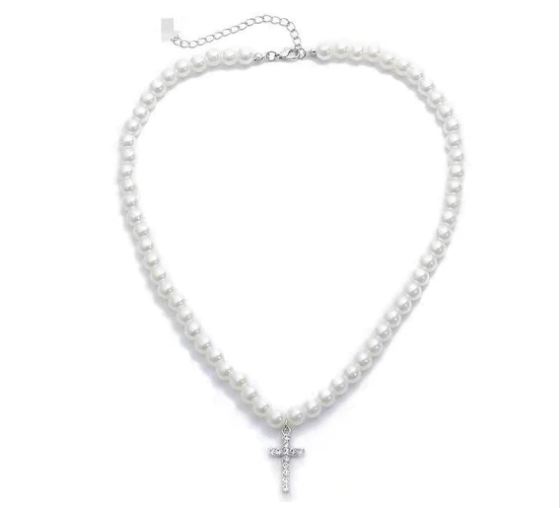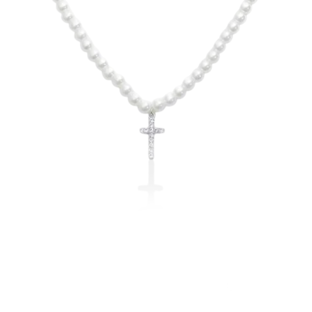 Colar pérola + Pingente Cruz Cravejado NJR